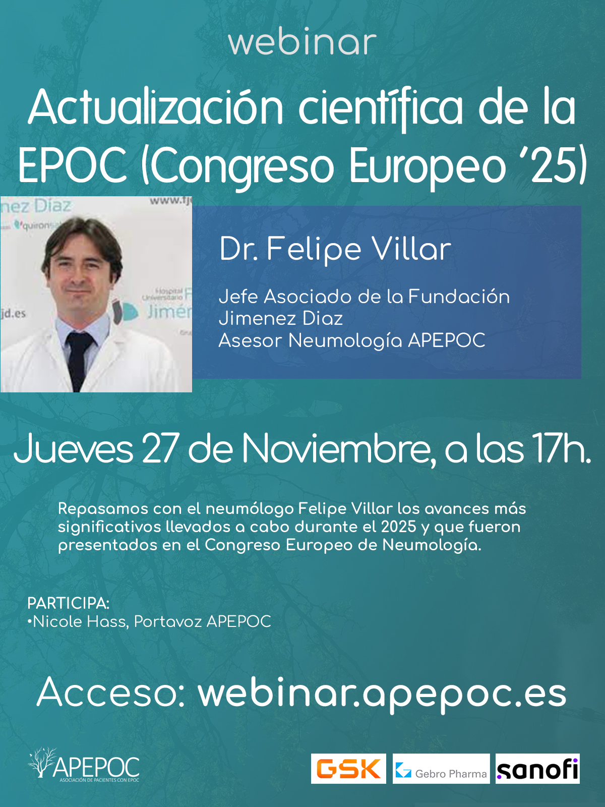 Este jueves 27 de noviembre a las 17h ofrecemos un nuevo webinar: Actualización científica de la EPOC(Congreso Europeo '25) con la gran colaboración del Dr. Felipe Villar, donde repasaremos los avances más importantes en este 2025 que fueron presentados en el Congreso Europeo de Neumología 2025.
