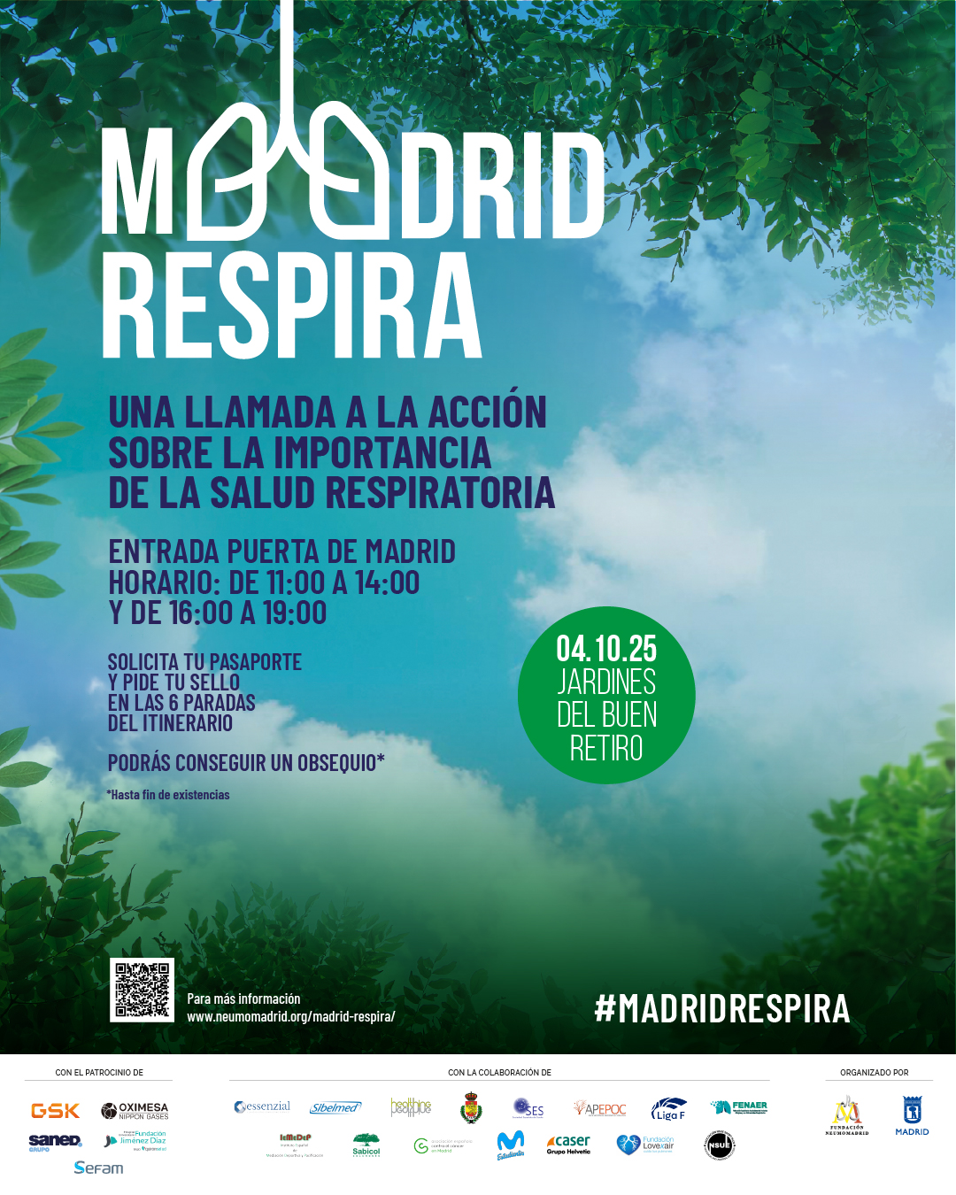 Madrid Respira es una iniciativa de Neumomadrid y el Ayuntamiento de Madrid, y que por cuarto año consecutivo se celebrará el próximo sábado 4 de octubre en los Jardines del Buen Retiro (Madrid) de 11 a 14 horas y de 16 a 19 horas.